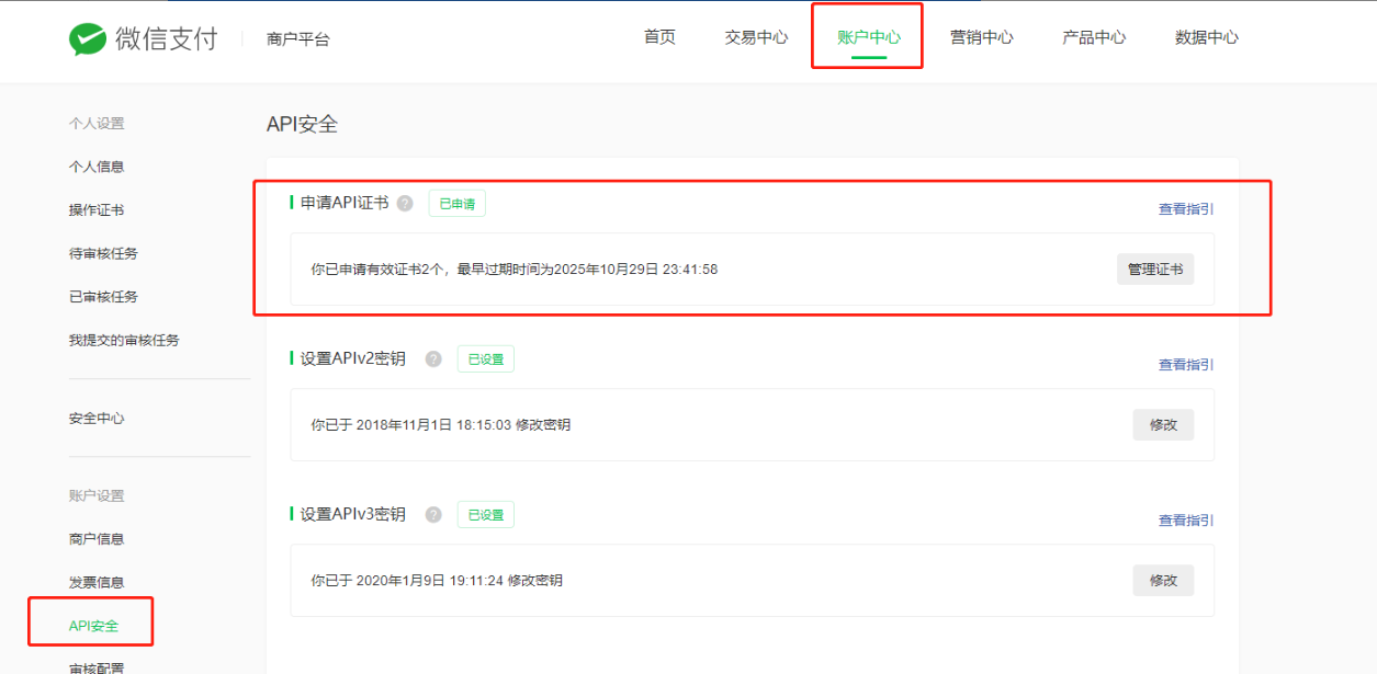 1、未设置aplv2密钥或重置aplv2密钥:登录微信商户号pay.weixin.qq.com -- 账户中心 -- api安全 -- 设置aplv2密钥,后台填写正确的密钥,注意填写时不能前后有空格.