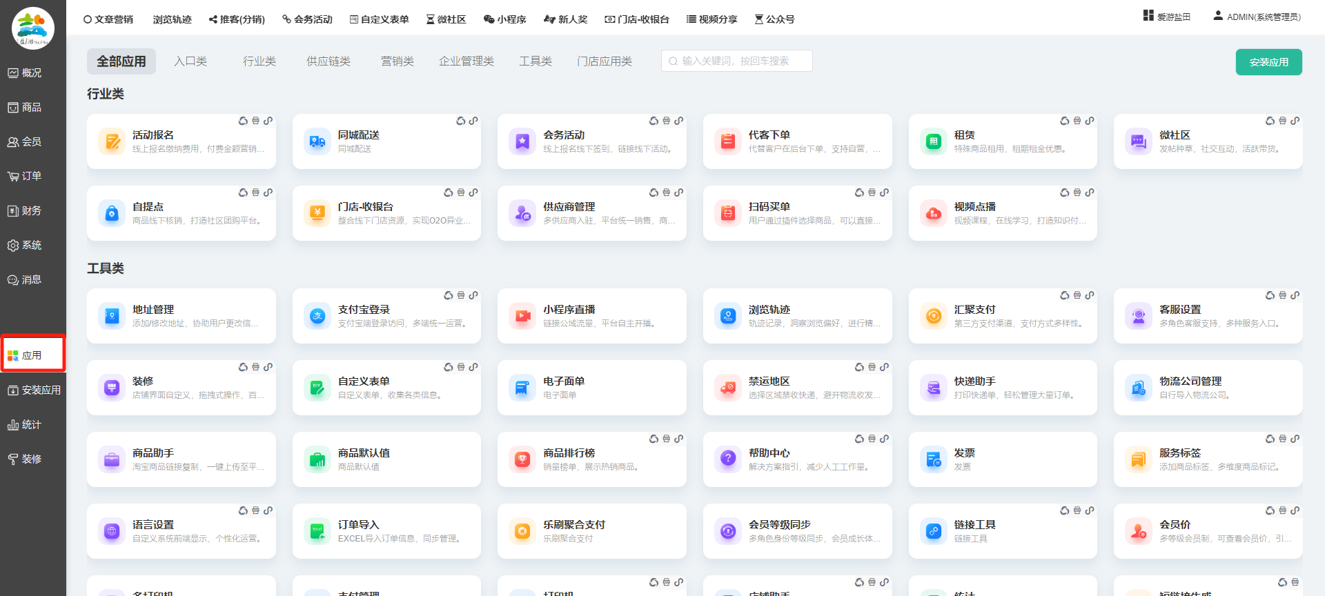 目录 搜索 展开 一、前期准备资料二、数字乡村码-上线操作指南1、服务号的申请流程及认证2、申请小程序流程3、开放平台绑定小程序和公众号三、数字乡村码-系统操作数字乡村码系统管理-概况数字乡村码-商品管理1、发布商品2、商品列表3、商品表单4、商品分类5、品牌管理6、配送模板7、评论管理8、优惠券管理9、商品标签10、退货地址设置11、满额优惠12、批量操作13、配送方式14、基础设置15、商品隐藏四、数字乡村码-会员管理1、全部会员2、会员等级3、会员分组4、资格申请5、会员设置6、推广中心设置7、会员邀请码8、会员关系链修改关系链修改记录9、会员合并记录10、账号注销管理11、会员设置中心五、数字乡村码-订单管理1、订单管理列表2、订单处理流程3、订单状态4、订单修改价格5、订单退款退货6、多包裹发货7、批量发货订单操作步骤8、催发货订单9、物流查询六、数字乡村码-财务管理1、余额设置2、会员余额3、充值记录4、转让记录5、余额明细6、收入明细7、提现设置8、提现统计9、积分管理10、转账审核11、收益广告12、批量充值七、数字乡村码-系统管理1、商城入口2、商城设置①、商城设置②、订单设置③、物流查询④、短信⑤、联系方式⑥、分类⑦、优惠券⑧、分享⑨、幻灯片⑩、广告位⑫、地图设置3、交易设置4、微信模板消息自定义消息模板(新版)自定义消息模板(旧版)小程序消息模板公众号模板消息变更公告5、语言设置6、权限管理7、多媒体管理八、数字乡村码-消息管理九、数字乡村码-应用管理十、数字乡村码系统-数据统计十一、数字乡村码-页面装修DIY1、模板管理2、店铺页面3、顶部导航4、底部导航5、DIY模板市场6、首屏广告7、基础设置8、装修DIY尺寸建议十二、供应商功能插件操作指南1、供应商2、门店-收银台门店申请和使用步骤门店管理①、门店-收银台 营销设置②、门店-收银台 分润设置门店分类门店申请门店审核门店商品门店商品订单收银台订单数据统计核销员基础设置默认设置门店装修3、微社区4、会务活动十三、营销插件操作指南活动报名提货卡新人奖微店问卷调查积分视频分享1、视频分享基础设置2、视频分享发现管理3、视频分享分类管理4、视频分享评论管理5、视频分享分红记录6、视频分享短视频中心每日红包幸运大抽奖签到优惠券二维码任务奖励优惠劵文章音频文章付费文章限时购新海报拓客卡操作流程积分活动素材中心视频红包十四、入驻门店应用类1、门店预约2、附近商品3、门店定位设置4、门店控制5、门店满额包邮6、门店满额减7、导入商品8、门店搜索9、门店股东10、核销券11、多门店核销1、商城后台设置2、前端功能演示十五、常见问题1、后台登录密码修改流程2、会员-余额,积分,后台如何进行充值与扣除3、如何修改上下级关系4、一种万能的获取商城小程序路径的方法 暂无相关搜索结果! 阅读次数:1768 本文档使用 模王系统 发布 九、数字乡村码-应用管理 九、商城管理-应用显示所有商城已安装并启用的应用,包含以下大类:具体根据自家商城后台系统显示为准。每个应用功能设置步骤较多,请查看相对应应用的学习文档。文档更新时间: 2024-01-08 10:36 作者:链上旅行