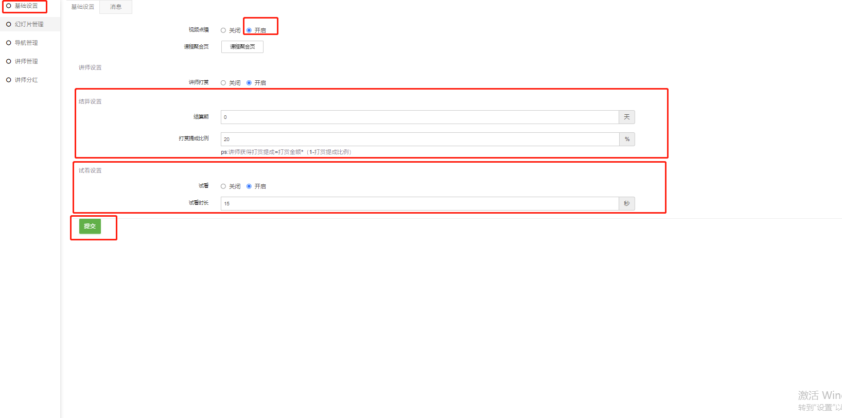 4.2选择行业设置-课程设置-开启课程点播-设置讲师-输入腾讯云转码链接加S后的链接,保存。