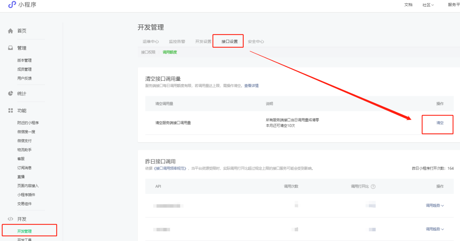 小程序 —— 登录公众平台mp.weixin.qq.com >> 开发 >> 开发管理 >> 接口设置 >> 清空服务端接口调用量。