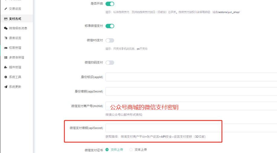 注意:若商城小程序的是跟公众号共用同主体的微信商户号,后台小程序的微信支付两证书也要重新上传.